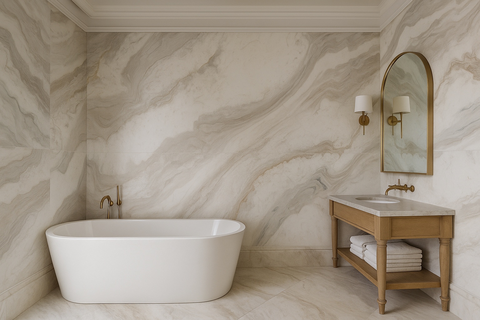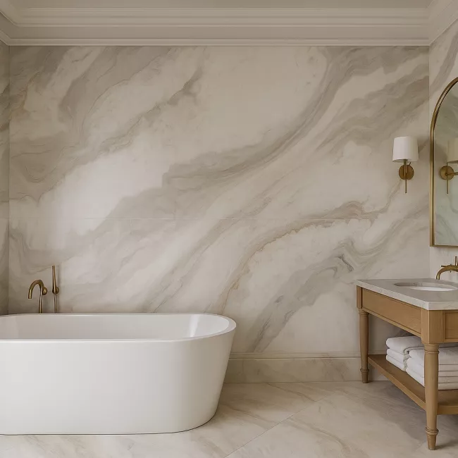 Este mármol destaca por su tonalidad beige claro, suave y cálida, que transmite una sensación de elegancia y serenidad. Sus vetas delicadas, apenas perceptibles, se extienden de forma irregular, creando un patrón orgánico que agrega profundidad y carácter sin ser abrumador. La uniformidad en su color y la sutileza de sus detalles lo convierten en una opción ideal para espacios que buscan un estilo sofisticado pero atemporal.Además, este tipo de mármol refleja la luz de manera suave, aportando luminosidad a los ambientes. Su versatilidad y belleza natural lo hacen una opción frecuente tanto en hogares modernos como en espacios clásicos.